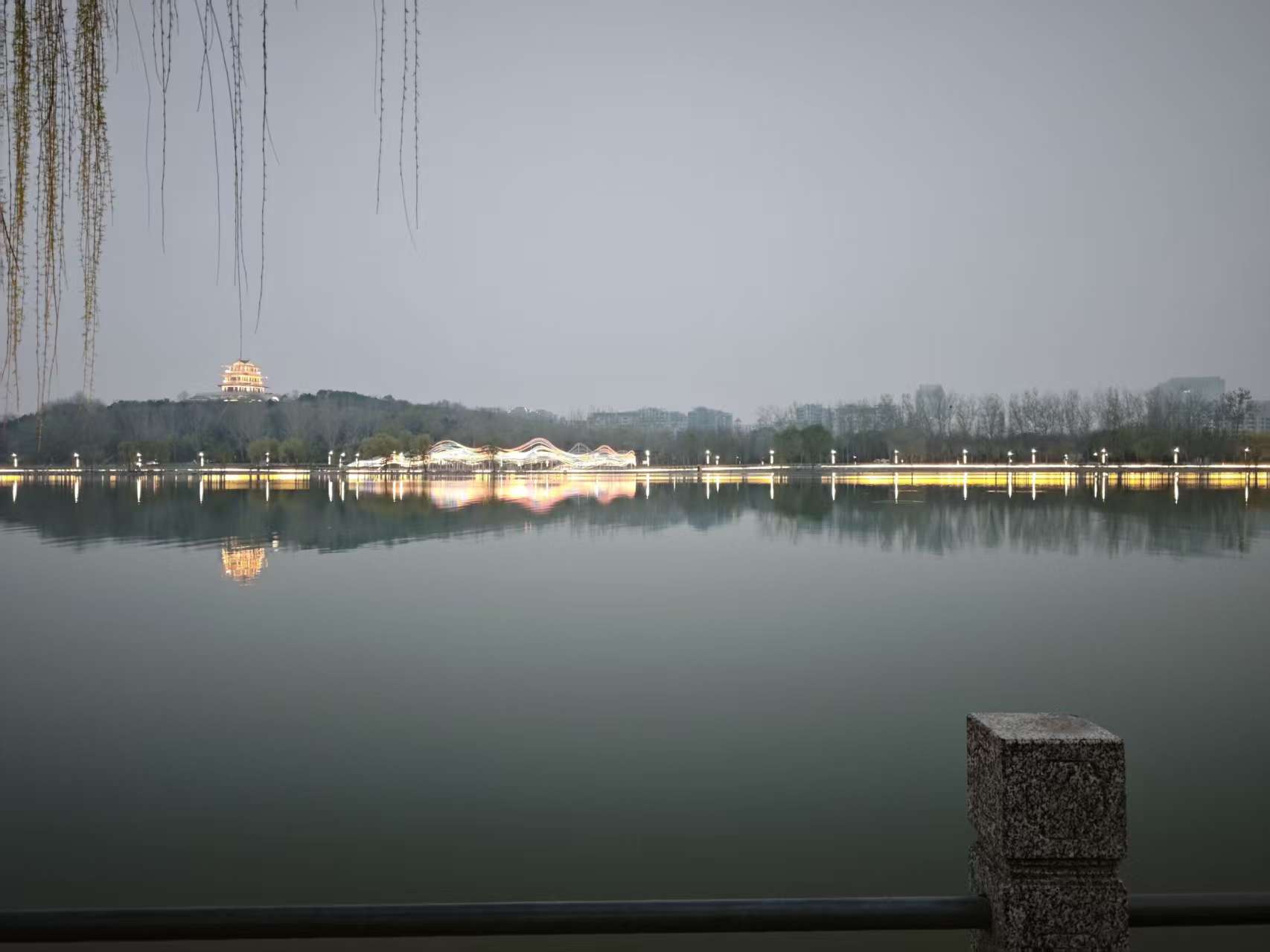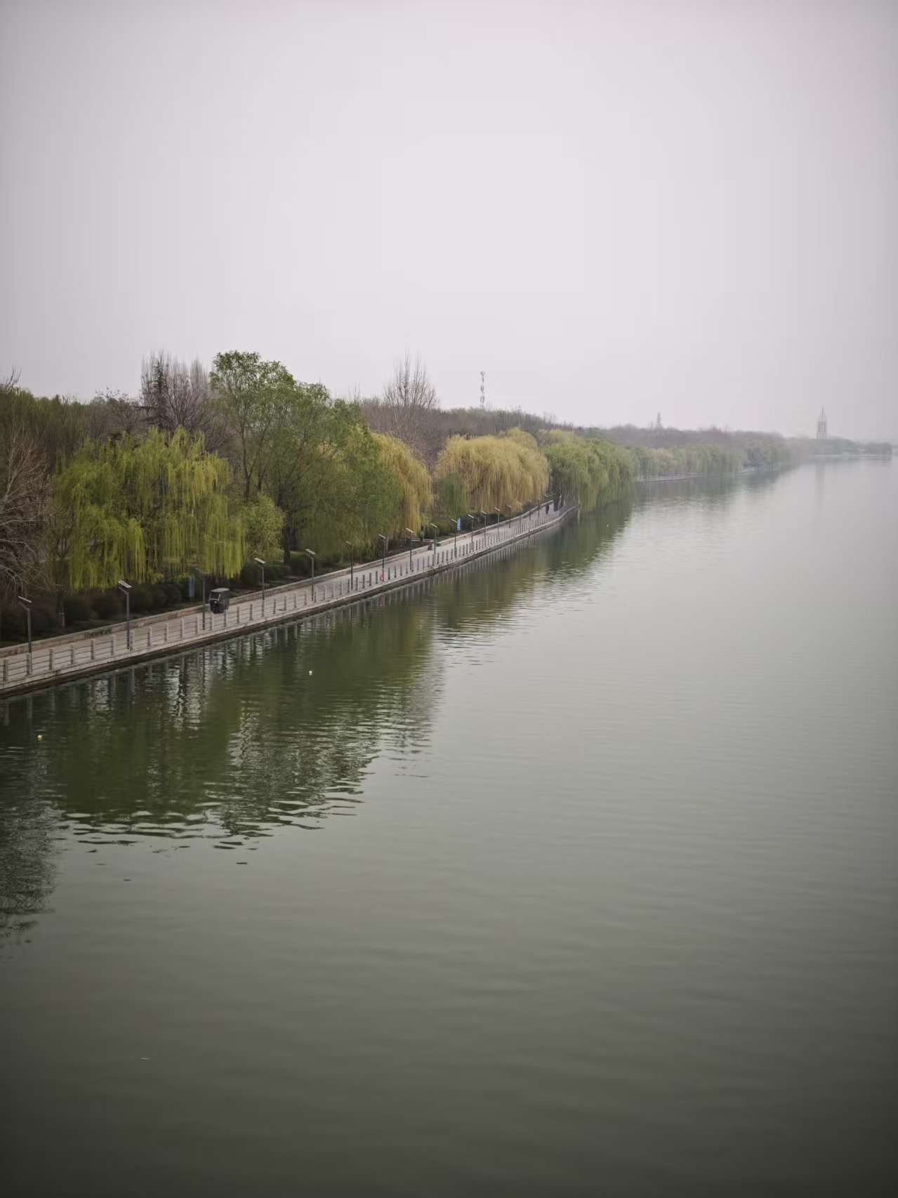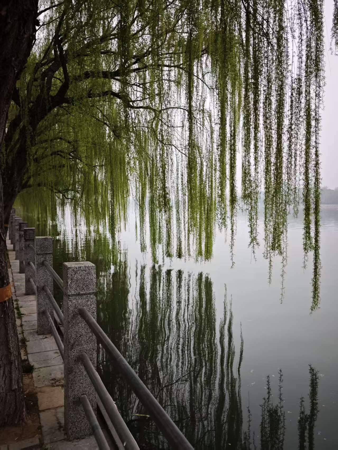 今天正好是多云间阴的天气,还有些雾霾,看到太平河水天一色,水里间或有一群或一对野鸭或鸳鸯之类的鸟在游荡,河堤柳树焕出了新绿。一切都那么悠闲自得,我的身心不禁也